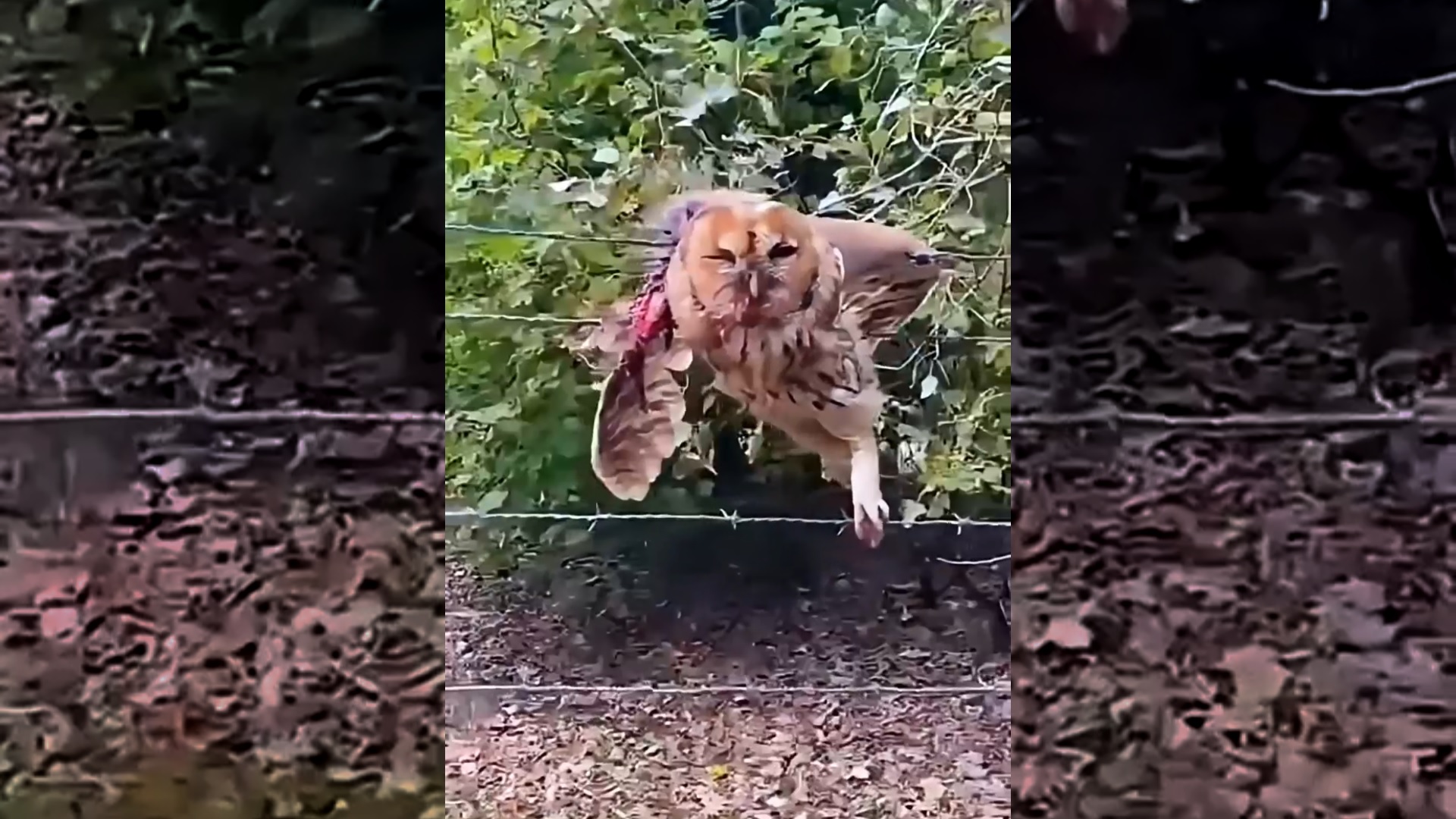 Behind the garden, tangled in the barbed-wire fence, we found an owl — a large, majestic creature now weak and bleeding. Its beautiful wings were trapped in the sharp metal spikes, and every struggle tore more feathers loose, staining its body with blood.